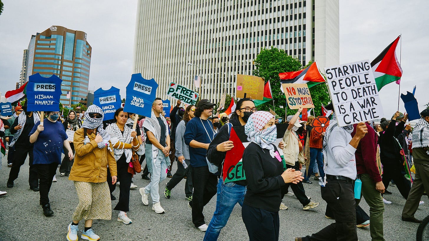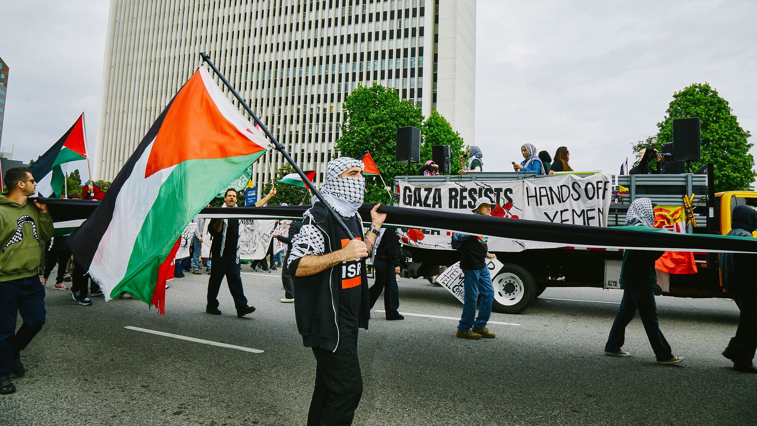 The march proceeded from the Israeli Consulate to the U.S. Federal Building on Wilshire and back, concluding peacefully, except for two Israeli flag-waving agitators whom the organizers effectively subdued within minutes. Guest speakers and organizers made it clear that the U.S. government has the full power to stop the genocide and stop arming Israel, but decides every day not to end the massacres.